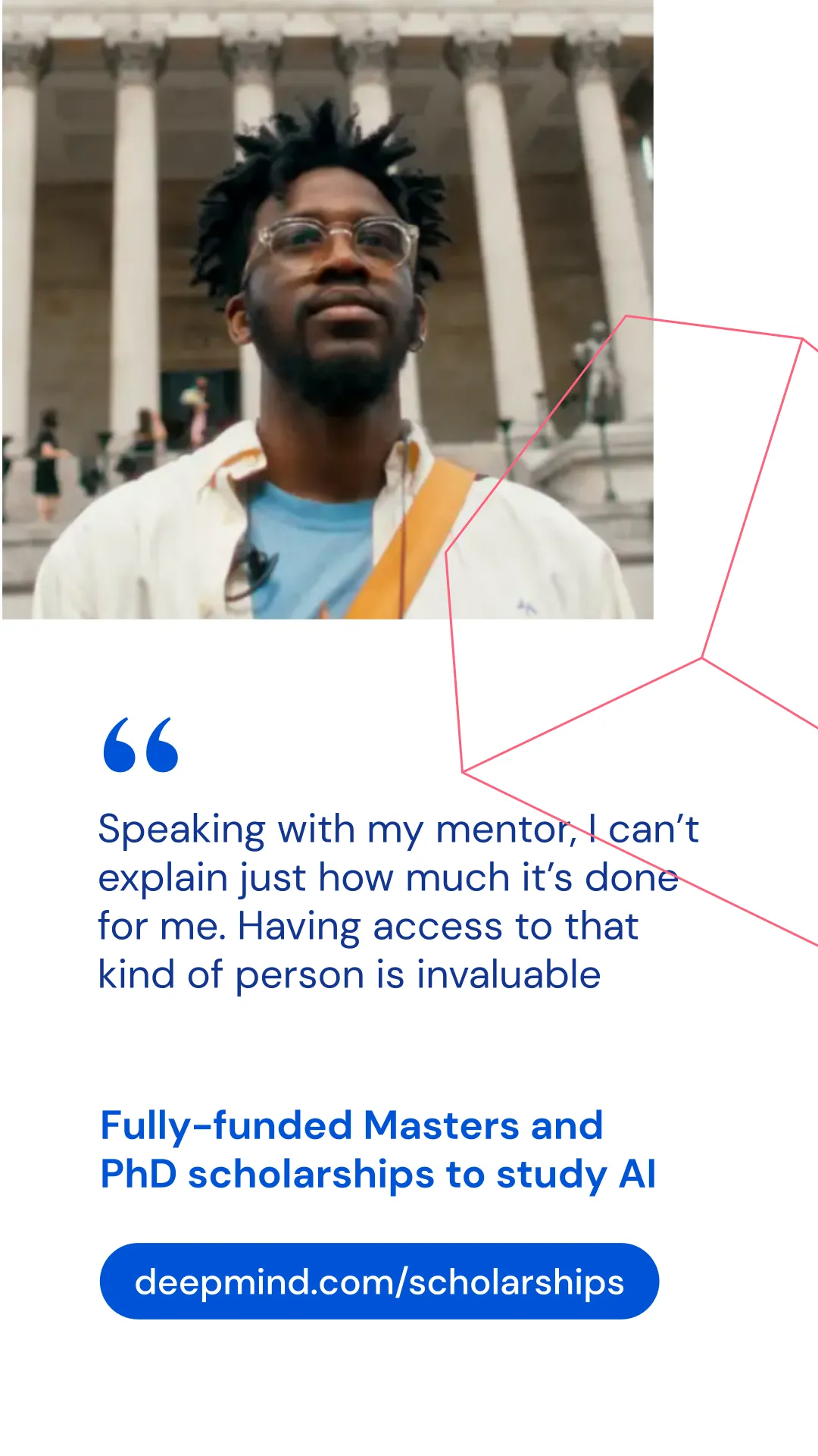 Established in 2017, DeepMind Scholarship programme provides financial support to students from underrepresented groups seeking to study graduate courses relating to AI and adjacent fields. Scholars are also offered support from a DeepMind mentor, and have opportunities to attend leading AI academic conferences and DeepMind events.
